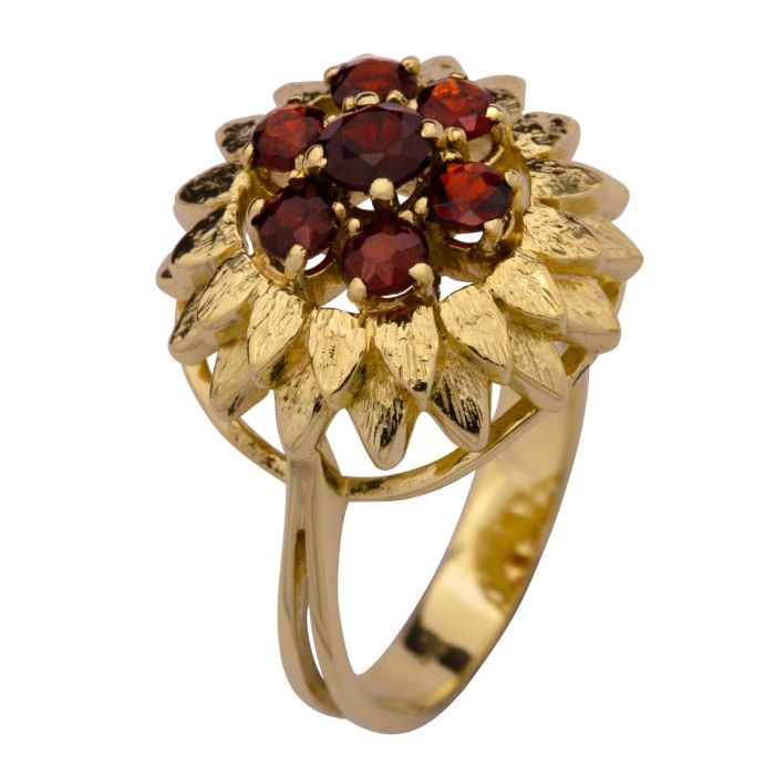 Das Schmuckstück hat einen getreppten Ringkopf, welcher eine Blüte darstellt. Der Blütenkelch ist mit 7 Granatsteinen dargestellt. Diese sitzen in Krappenfassungen.