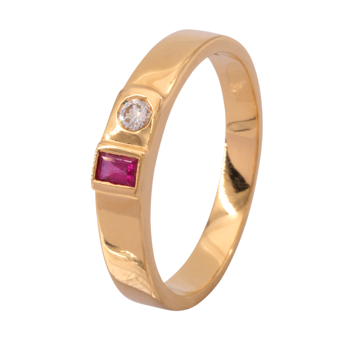 Mittig ziert ein Rubin in Carreéschliff, welcher in einer erhöhten Zargenfassung sitzt, den Ring. Daneben funkelt zusätzlich ein Brillant von 0,08 ct in eingeriebener Fassung.